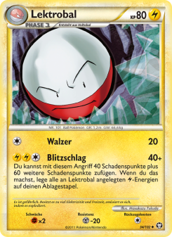 Du kannst mit diesem Angriff kann 40 Schadenspunkte plus 60 weitere Schadenspunkte zufügen. Wenn du das machst, lege alle an Lektrobal angelegten -Energien auf deinen Ablagestapel.